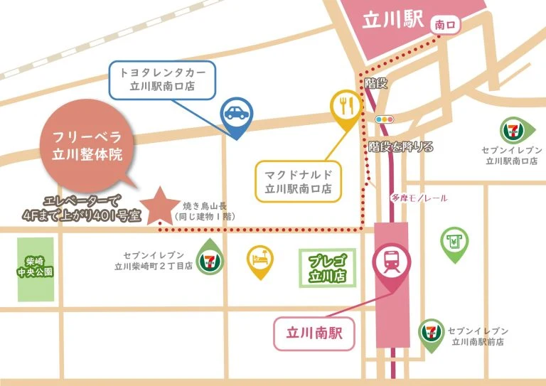 アクセス フリーベラ立川整体院への道順 道順がご不明な場合は、詳しくご説明させていただきますのでお問い合わせください。 ❶JR「立川駅」到着したら南口に向かいます。 ❷駅から外に出たら右側に向かい2つ目の階段まで歩きます。 ❸1つ目の階段を通り越して左に曲がります。(南改札口から出ると近道です) ❹マクドナルドの目の前の階段を降ります。 ❺階段を降りたら目の前の横断歩道まで直進します。 ❻コインパーキングを右手に進み、横断歩道の手前を右に曲がります。 ❼横断歩道手前を右に曲がったら直進します。 ❽左手にあるセブンイレブンの交差点をさらに直進です。 ❾交差点から10秒ほどで右手に焼き鳥屋「山長」さんが見えてきます。 ➓焼き鳥屋さんを越えて隣の入り口から扉を開けてください。エレベーターで4階まで上がり401号室へ。 ようこそ「フリーベラ立川整体院」へ。 Googleマップ サンプル整体院 〒190-0023 東京都立川市柴崎町2-2-9 日盛ビル401 アクセス:JR中央線・南武線・青梅線 立川駅より 徒歩3分 Google Mapで開く